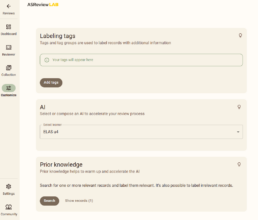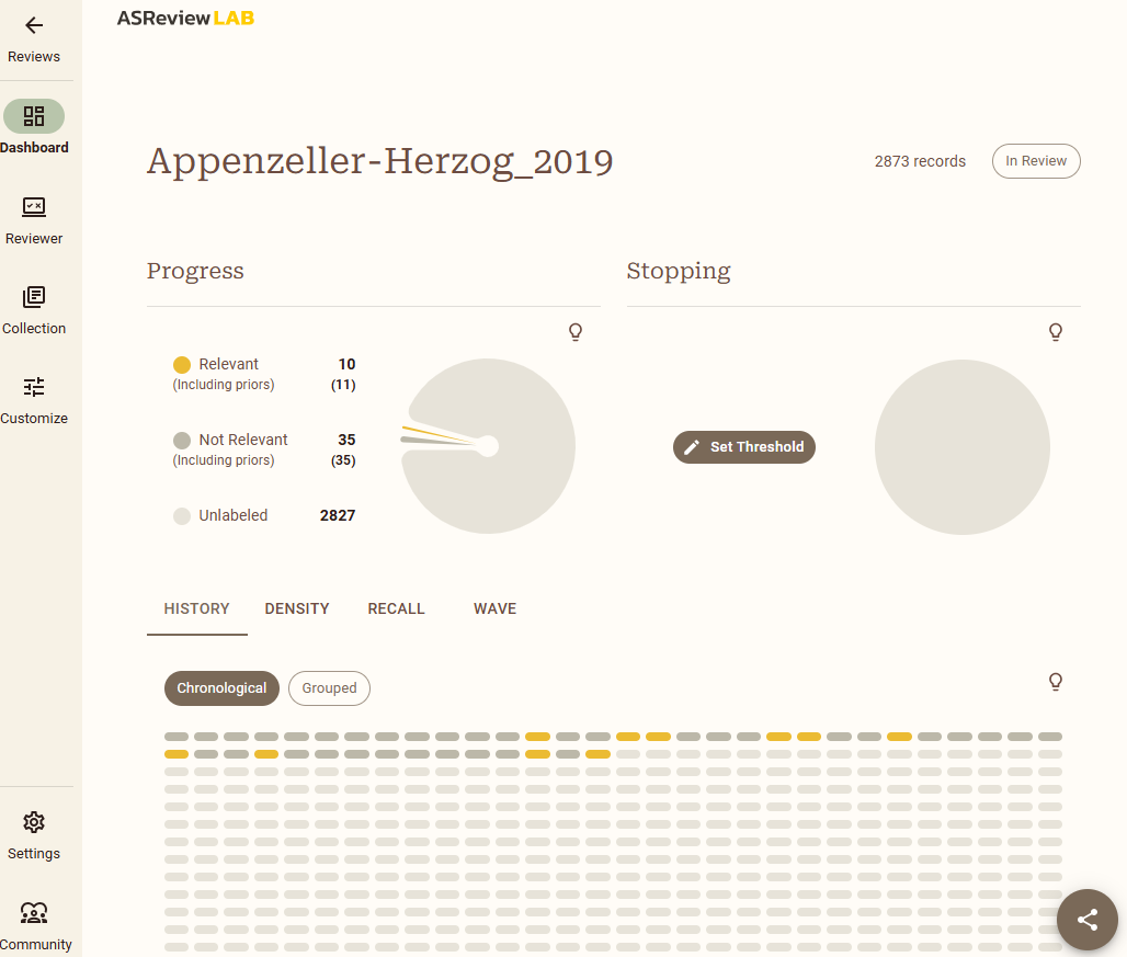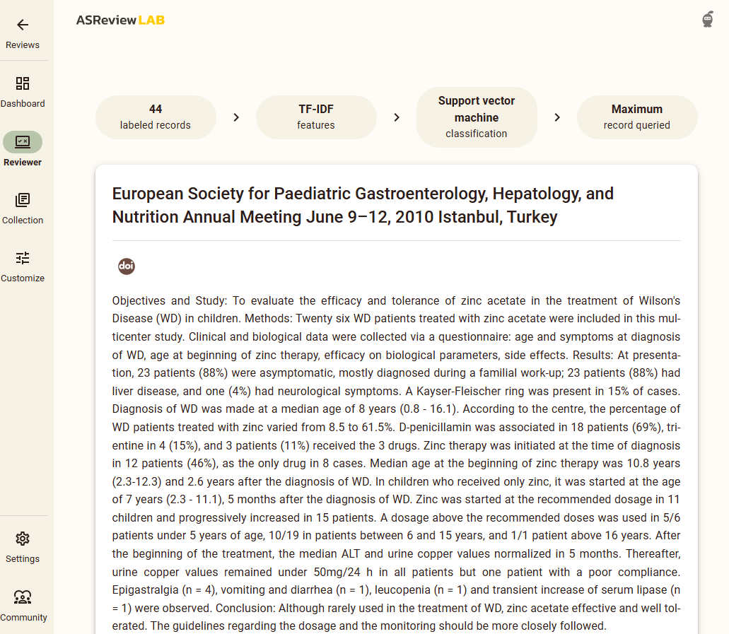 - Reviewer: aquí van apareciendo los artículos que hay que ir marcando como incluidos o excluidos manualmente. El aprendizaje es activo, por lo que el investigador tiene que empezar etiquetando los artículos que va sugiriendo el algoritmo aplicando los criterios que haya previamente fijado.